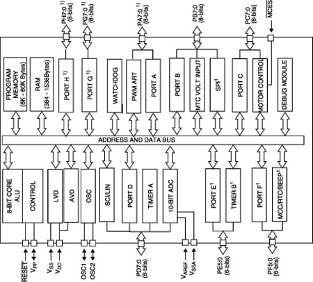 8-bit Data Manipulation 63 Basic Instructions with illegal opcode detection 17 main Addressing Modes 8 x 8 Unsigned Multiply Instruction True Bit Manipulation - In-circuit Debug