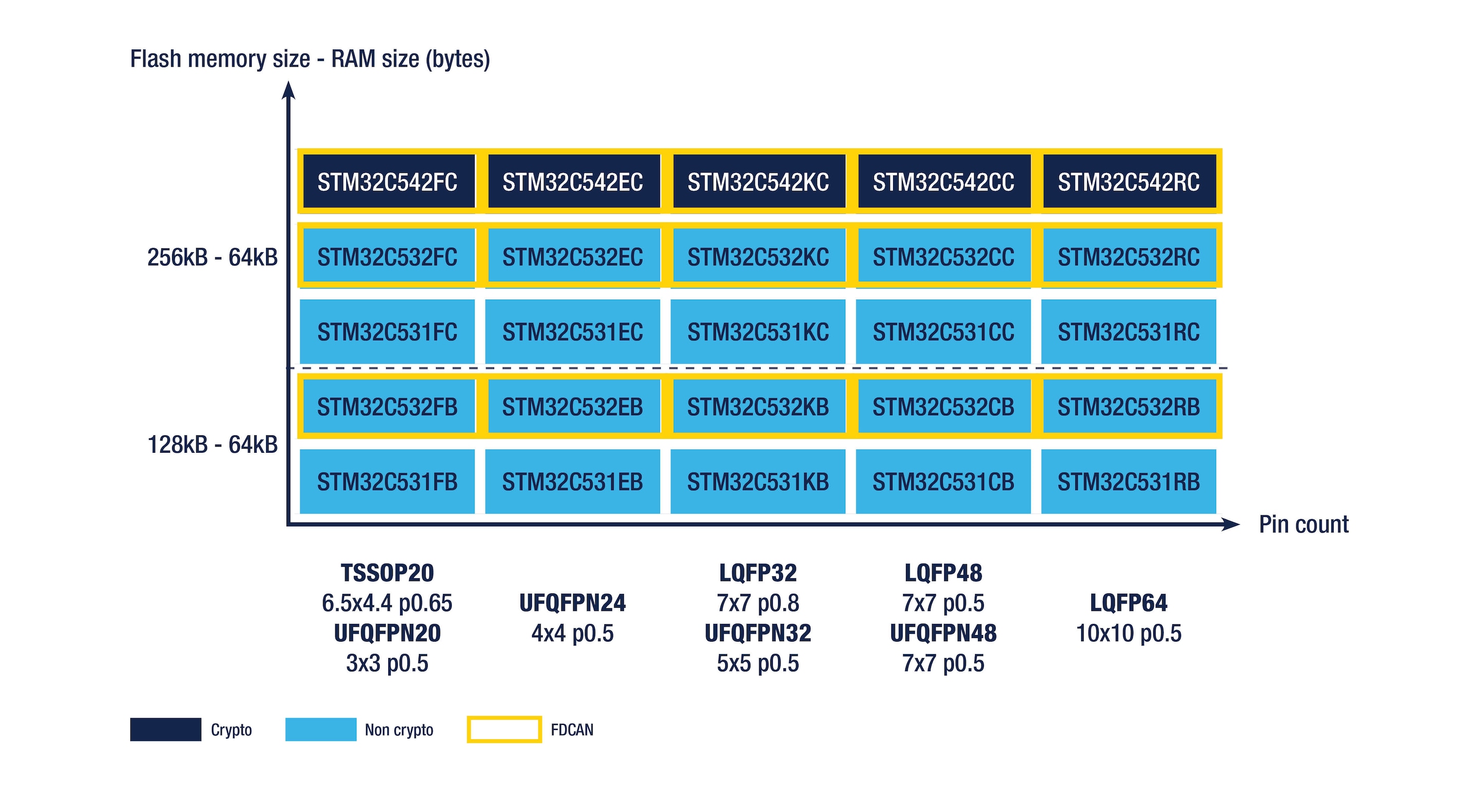 These devices provide up to 256 Kbytes of flash memory and 64 Kbytes of RAM, along with the option of two FDCAN interfaces.