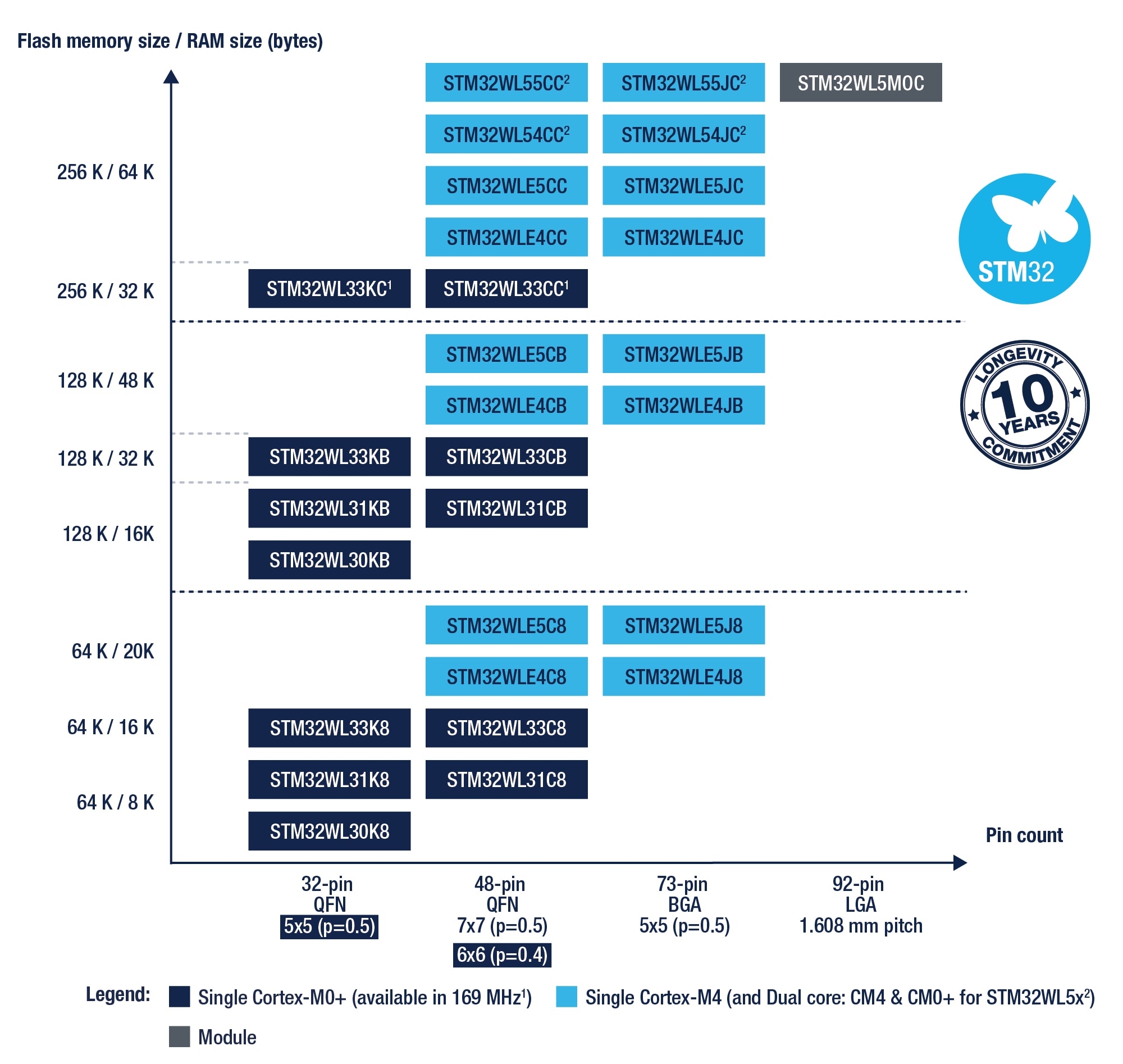 The STM32WLE5/E4 and STM32WL55/54 MCUs are available and as well as a dedicated STM32CubeWL software.
