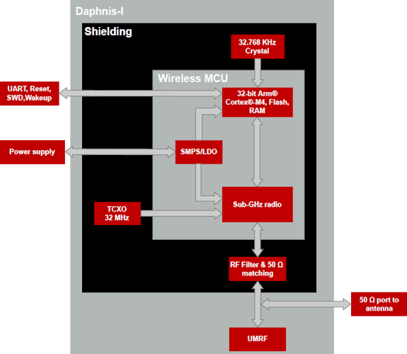 Daphnis-I is a low-power long-range transceiver module for LoRaWAN® applications based on the STM32WLE5CCU6 chip. Within a LoRaWAN® network, Daphnis-I takes the role of an end node. A LoRaWAN® gateway is required to use Daphnis-I as intended. Daphnis-I module complies with class A, class B, and class C of LoRaWAN® 1.0.4 specifications.