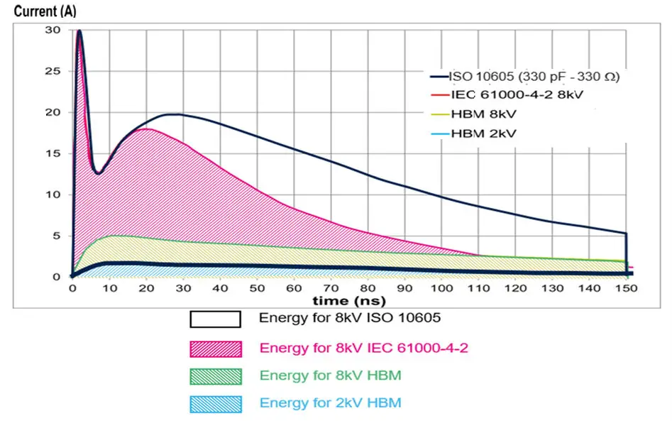 保護デバイスがなければ、ESD耐性について一般的な人体モデル(HBM)もしくは帯電デバイス・モデル(CDM)規格に従って定格化されているICは、ISO規格に定義された高電流や高電圧に耐えることができません。