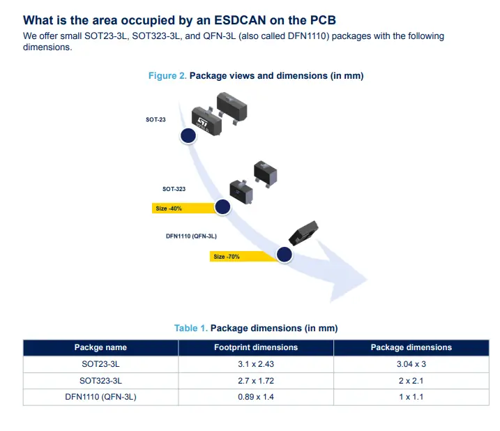 Use the STMicroelectronics low capacitance ESDCAN for high-speed CAN, such as 3 pF and 17 pF. Low speed CAN may use 30 pF, or the same low capacitance devices used for high-speed lines. See ESDCAN01-2BLY, ESDCAN03-2BWY, ESDCAN03-2BM3Y for product details. The first two products have different capacitance values, and the third has low capacitance with a small footprint.