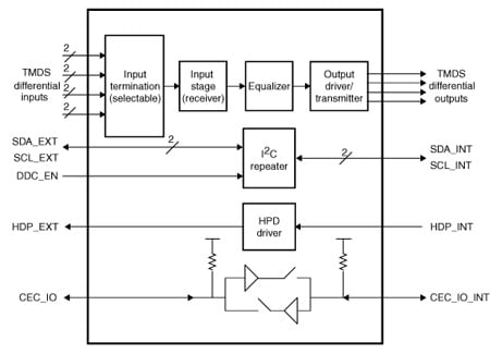 - Conforms to the transition minimized differential signaling (TMDS) voltage standard on input and output channels