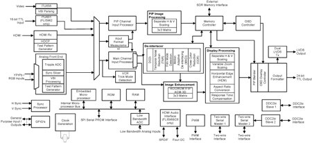 The integrated picture-in-picture, embedded microcontroller, versatile OSD engine, low bandwidth general purpose ADC, and dual LVDS transmitters (or optional 24-bit TTL output) enables cost-effective HDTV-ready multi-function LCD monitor or LCD TV solutions.