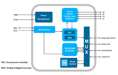 The STMPE812 is a 4-wire resistive touchscreen controller with 4-bit port expander integrated. The touchscreen controller is designed to be fully autonomous, requiring only minimal CPU intervention for sampling, filtering and pre-processing operations.